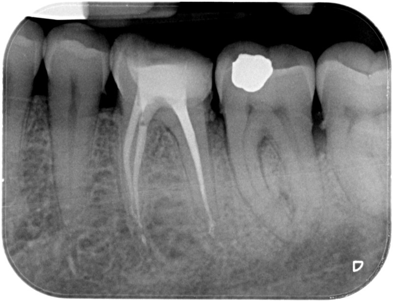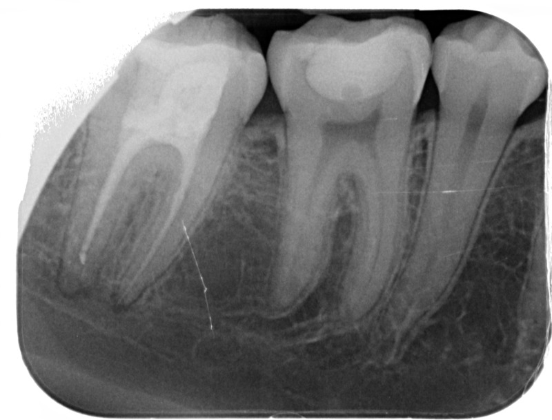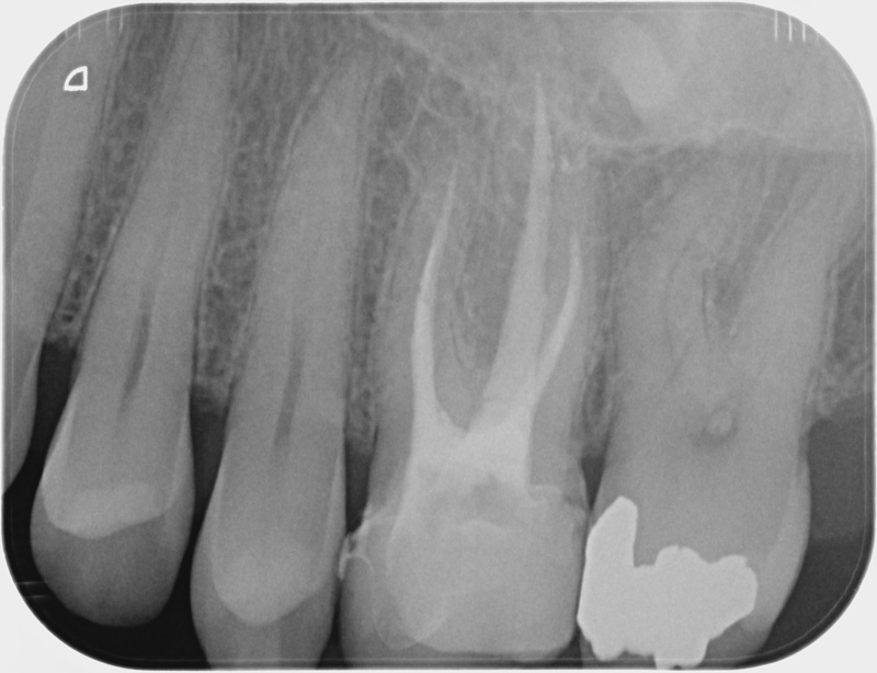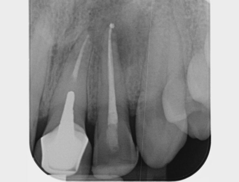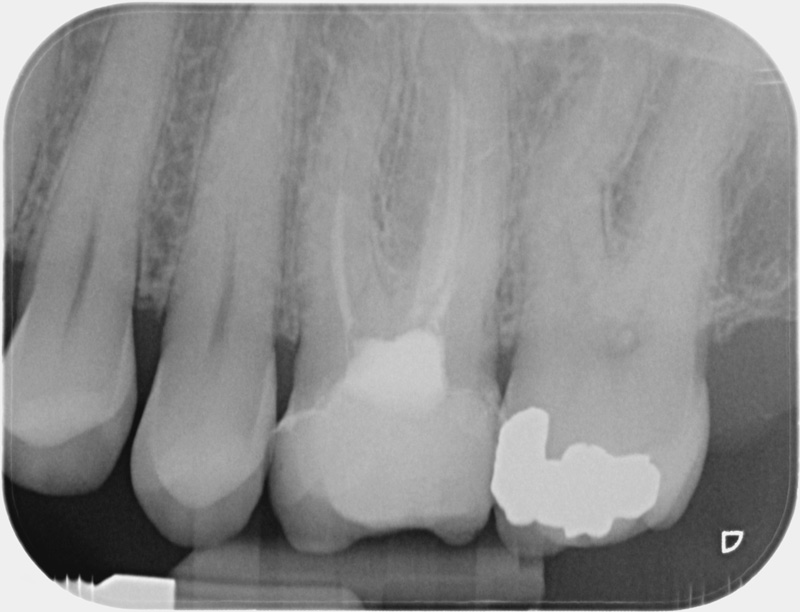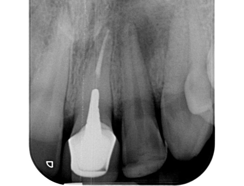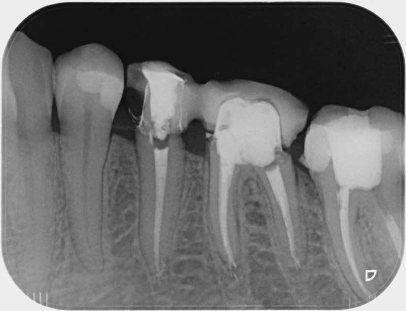 Traitement endodontique : Sous anesthésie locale et à travers la protection d’un champ opératoire nous accédons à la pulpe de la dent à soigner, puis aux canaux de ses racines que nous devons désinfecter. Ce soin nécessite l’élimination complète de la source de contamination (souvent la carie) parfois sous une ancienne reconstitution ou une couronne qu’il faut alors retirer. Une fois le nettoyage et la mise en forme des canaux réalisés, nous les obturons de façon hermétique avec un ciment et un matériau thermoplastique appelé Gutta Percha. Ceci afin d’empêcher une nouvelle prolifération bactérienne et d’assurer le maintien de la dent dans ses structures de soutien (ligament parodontal et os alvéolaire). L’ouverture effectuée au centre de la dent sera d’abord refermée avec un pansement provisoire avant d’envisager ensemble la reconstitution d’usage : un composite, un inlay-onlay ou une couronne.
